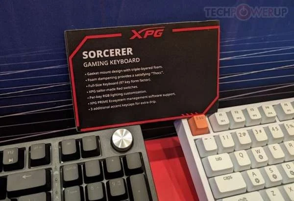 XPG также оставила немного места на стенде для своей новой линейки игровых клавиатур Sorcerer — стандартная модель представляет собой «полноразмерную» плату с форм-фактором 96 %, доступную в черном или белом цвете. Простая эстетика Sorcerer может быть нарушена несколькими (тремя) дополнительными клавишами с акцентом XPG. Серебристый диск управления, похоже, является стандартным креплением. Конструкция с прокладкой и тройным пенополиуретановым слоем обеспечивает изысканный и приятный набор текста. XPG оснастила Sorcerer специальными переключателями Red и системой RGB-подсветки на каждую клавишу (управляется и настраивается с помощью программного обеспечения XPG Prime).