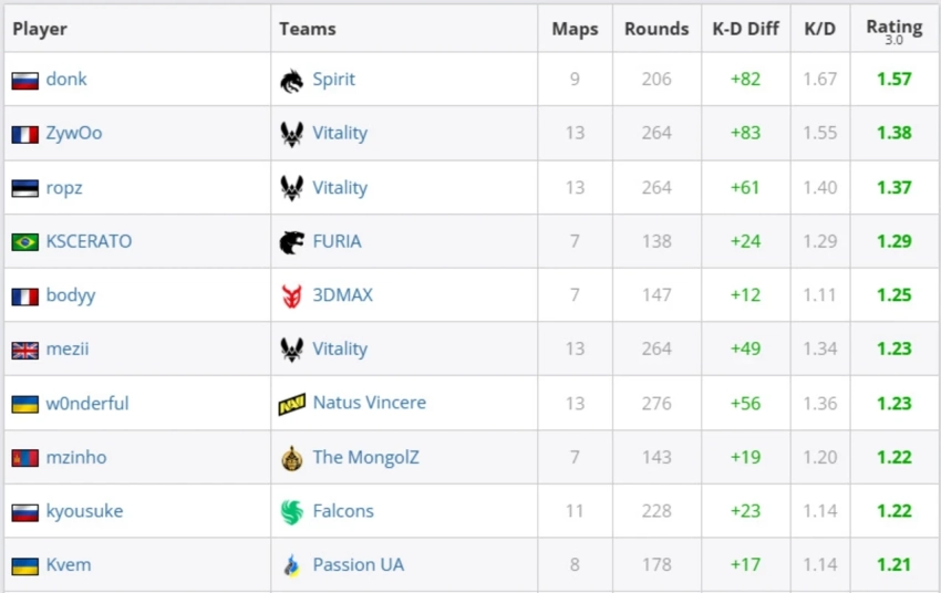 Ближайшим преследователем Крышковца стал снайпер Team Vitality Матье «ZywOo» Эрбо. Француз отстал от лидера на 0,19 пункта, однако провел на сервере на четыре карты больше. В итоге именно ZywOo был признан MVP турнира благодаря победе своей команды в гранд-финале.