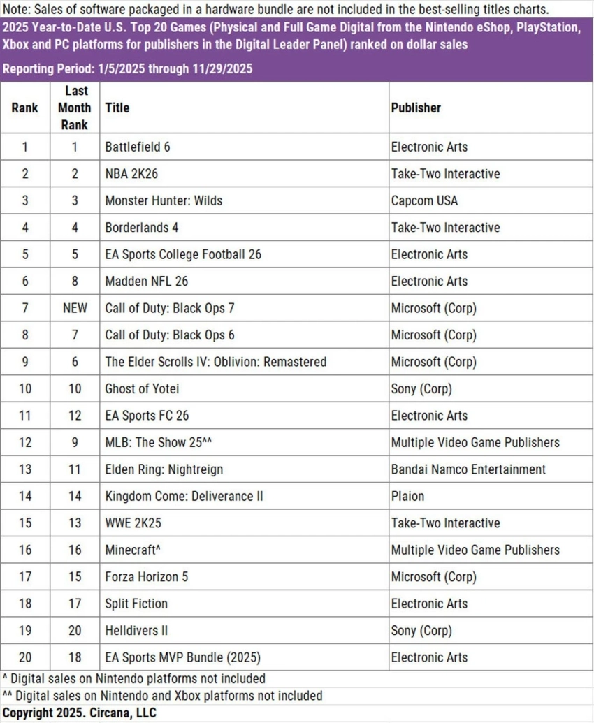 Battlefield 6, NBA и Monster Hunter сохраняют лидерство по продажам в 2025 году в США