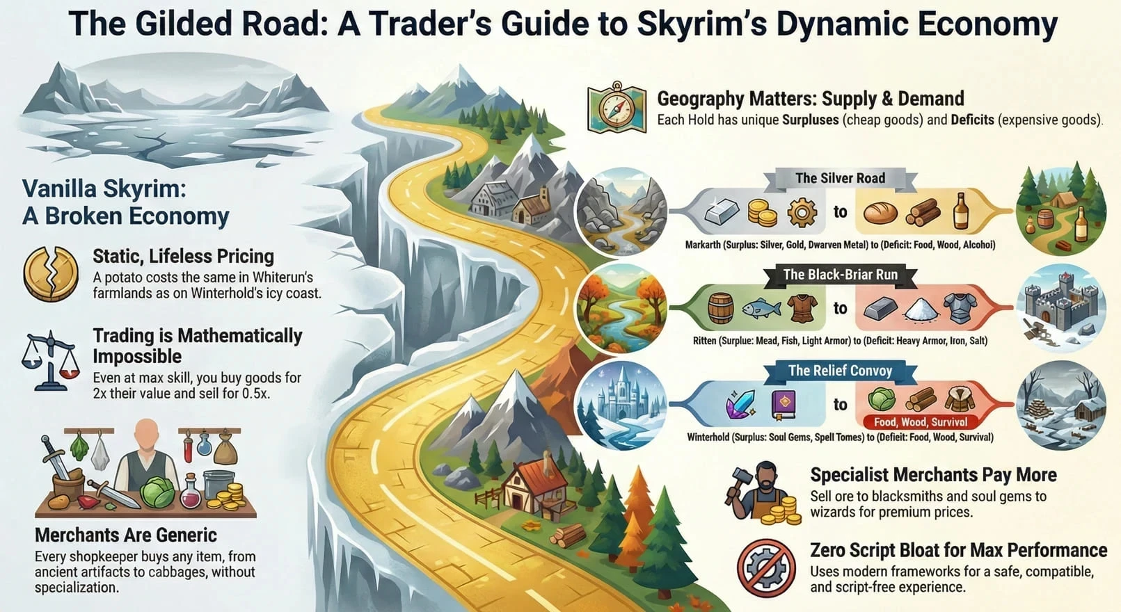 Обложка: официальный арт мода The Gilded RoadСвежий мод для The Elder Scrolls 5: Skyrim меняет систему экономических выгод и торговли в сторону реализма. С The Gilded Road правило спроса и предложения начинает существенно влиять на игровой процесс.