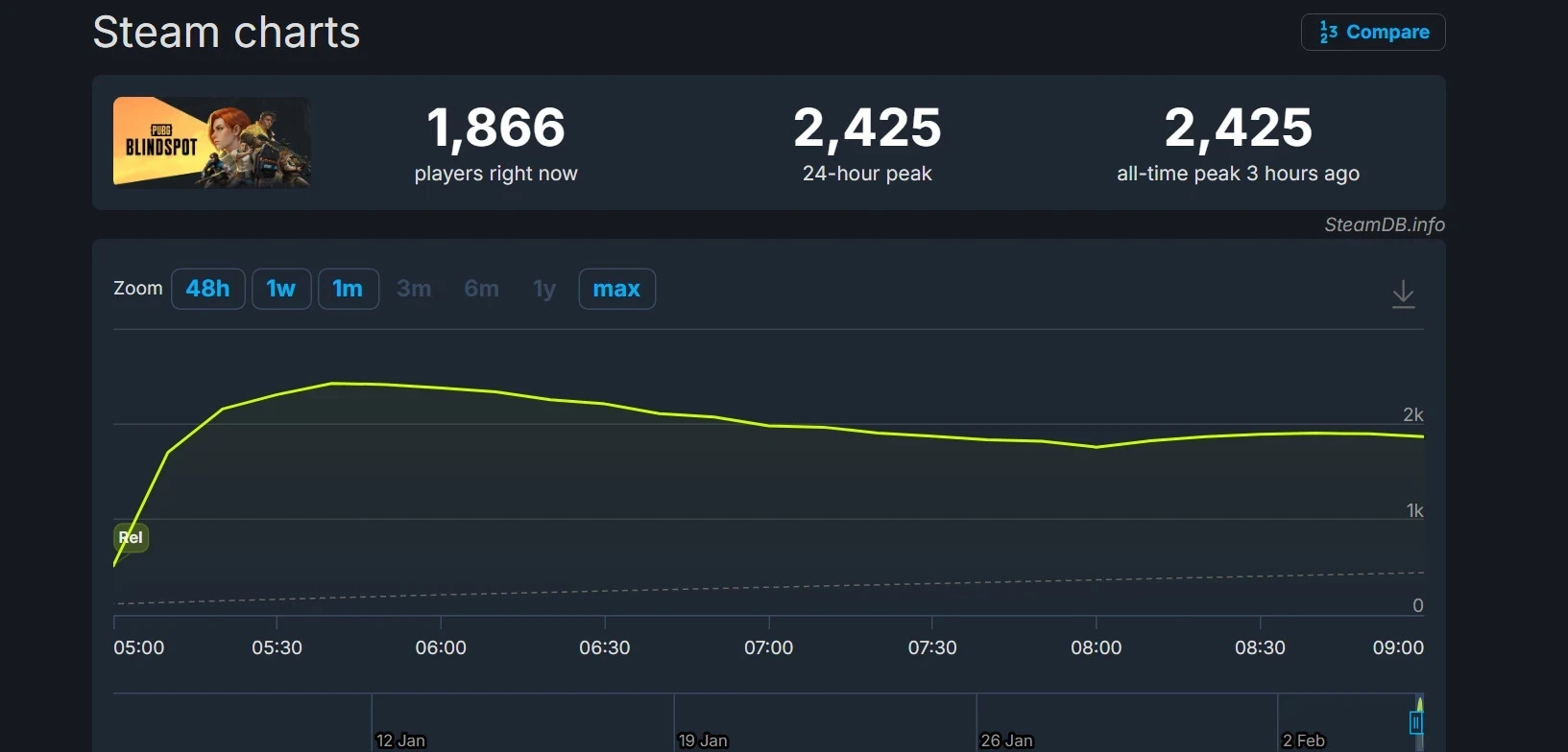 Пиковый онлайн PUBG: Blindspot практически достиг отметки в 2,5 тыс. человек. Вероятно, в ближайшее время игра сможет обновить свой рекорд.
