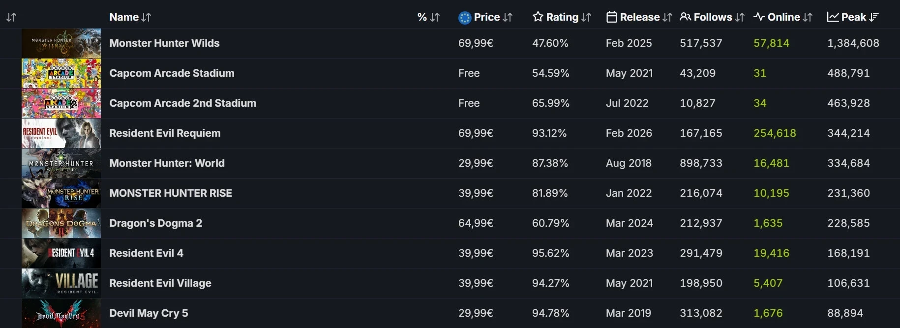 Нерушимым лидером остаётся ролевой экшен Monster Hunter Wilds, чей пиковый онлайн превысил 1,3 млн игроков в феврале 2025 года. А второе и третье места достались бесплатным Capcom Arcade Stadium и Capcom Arcade 2nd Stadium — обе в своё время собрали более 400 тысяч игроков на пике. Почему? Выпадение карточек для продажи на торговой площадке.