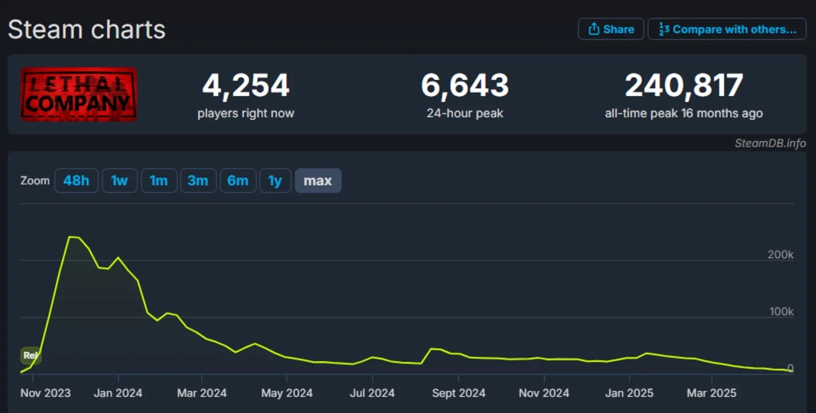 Возможно, на эту мысль повлиял успех R.E.P.O. — другого кооперативного хоррора, который также получит первое масштабное обновление в этом году. Игра уже преодолела пиковый онлайн в 270 тысяч игроков, чем не может похвастаться Lethal Company.