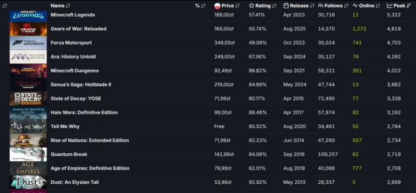 Зато Gears of War: Reloaded занимает далеко не худшие позиции по пиковому онлайну среди игр издателя Xbox Game Studios. Переиздание культового боевика смогло обогнать автосимулятор Forza Motorsport (4,7 тысячи игроков), Minecraft Dungeons (4 тысячи игроков), Senua’s Saga: Hellblade II (3,9 тысяч игроков) и другие игры, созданные внутренними студиями Microsoft.